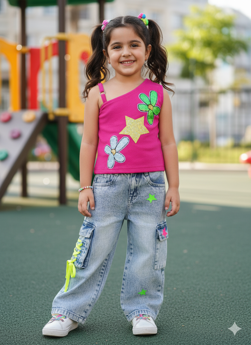 Girls One Shoulder Flower Patch Top[GT-729] [9 Month -12Years]