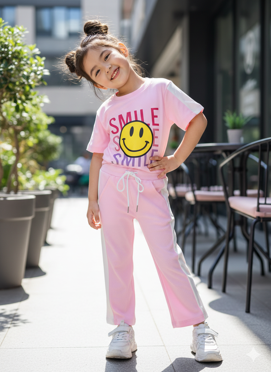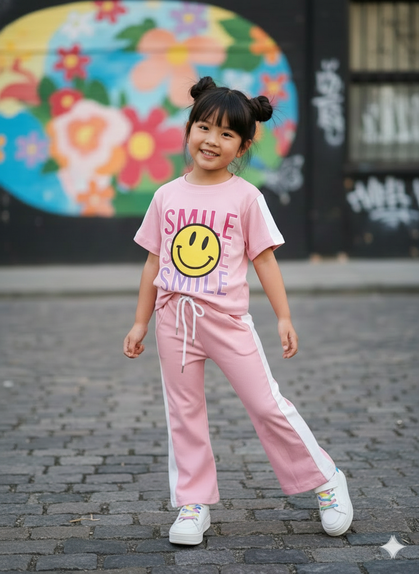 Girls Casual Smiley Baby Pink Co-Ord Set [GCS-6233](4-12 Years)