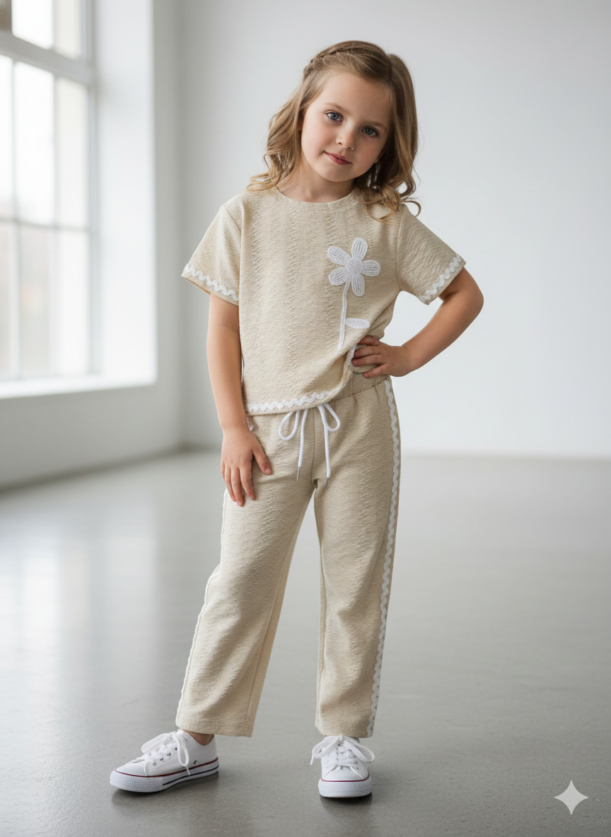 Girls Casual Flower Patch Beige Co-Ord Set [GCS-6238](4-12 Years)
