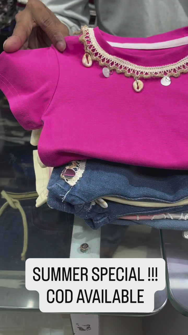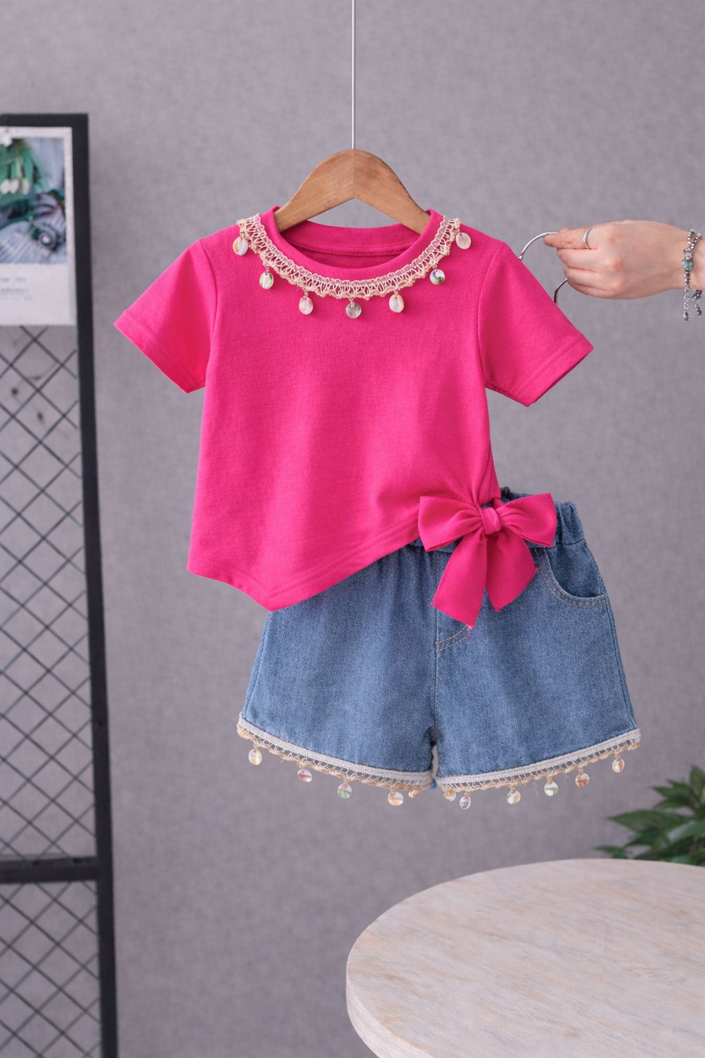 Girls Hot Pink Co-ord Set Asymmetric Knotted Top with Shell-Trim Denim Shorts [GCS-6493] (2-6 Years)